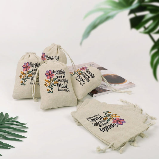 Fearfully and Wonderfully Made – Christian Cotton Linen Drawstring Bags (Pack of 8) Eco-Friendly & Faith-Inspired Storage