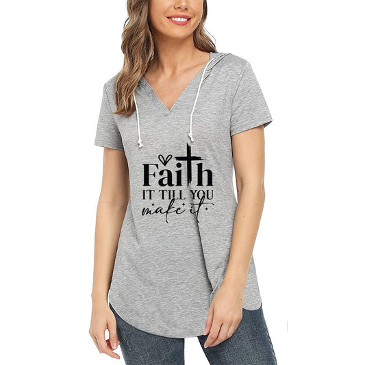 Faith It Till You Make It - Women's Christian Short Sleeve V-Neck Gym Hoodie T-Shirt | Inspirational Activewear