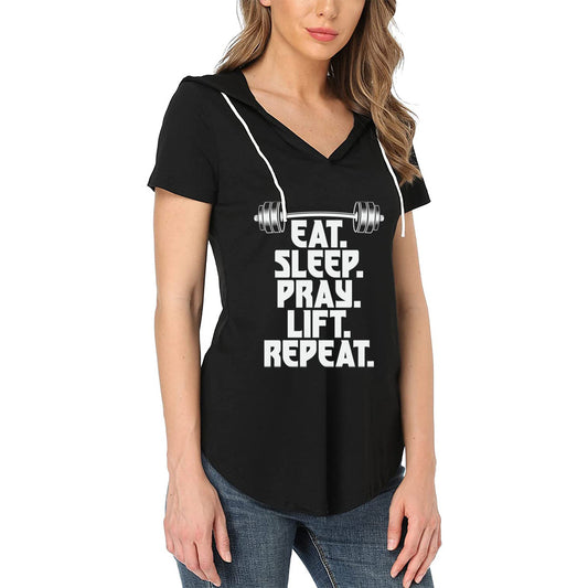 Eat Sleep Pray Lift Repeat - Women's Christian Workout Gym Hoodie T-Shirt | Short Sleeve V-Neck Activewear