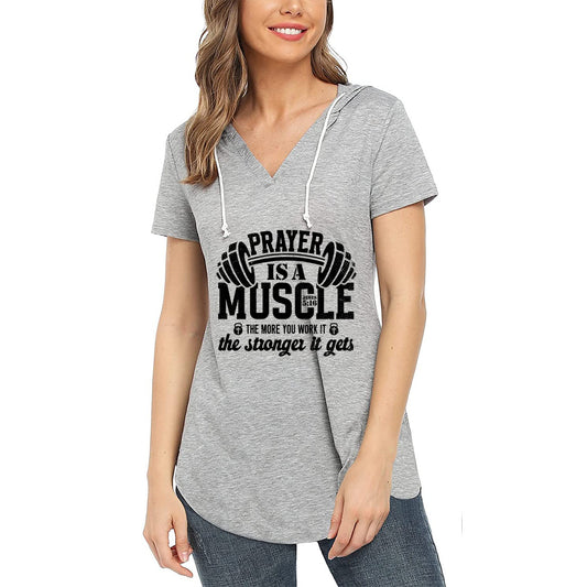 Prayer Is a Muscle - Women's Christian Short Sleeve V-Neck Gym Hoodie T-Shirt | Inspirational Activewear