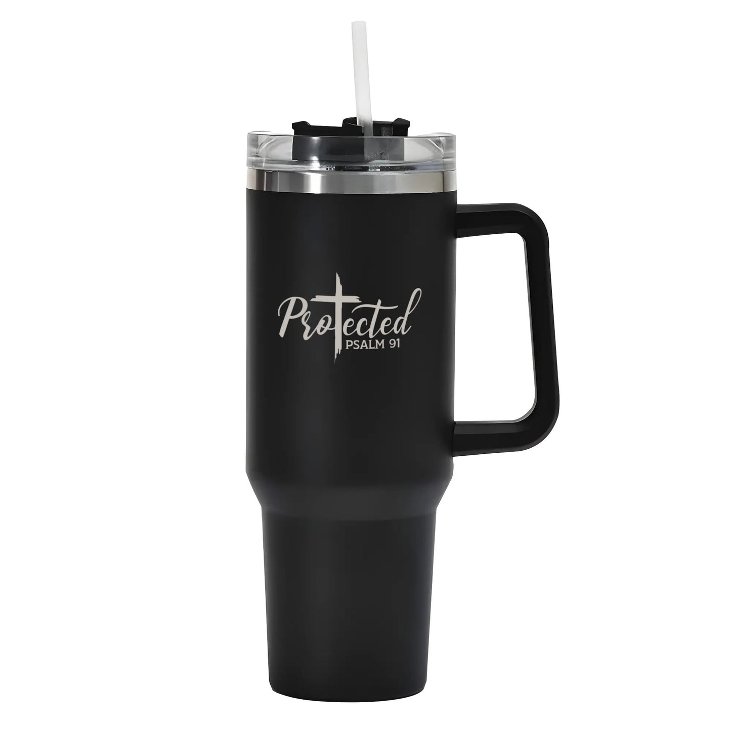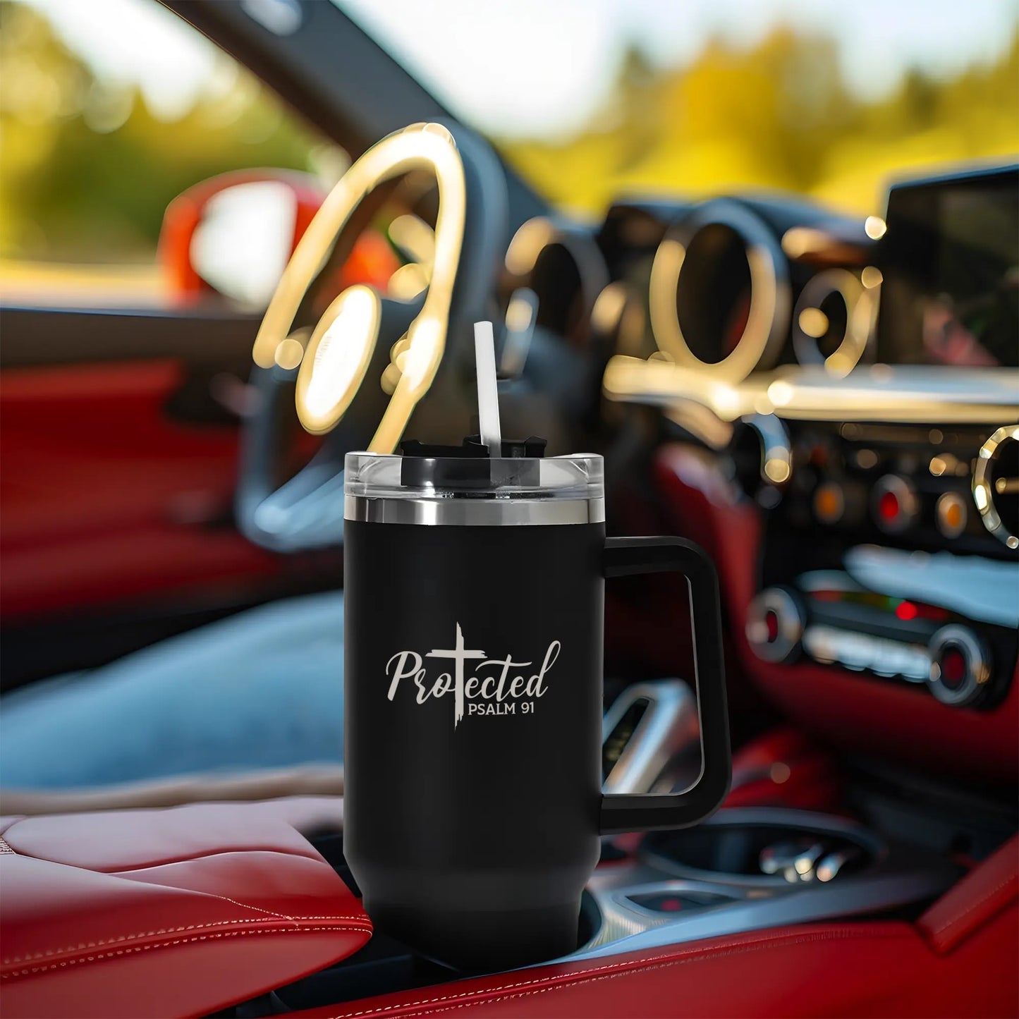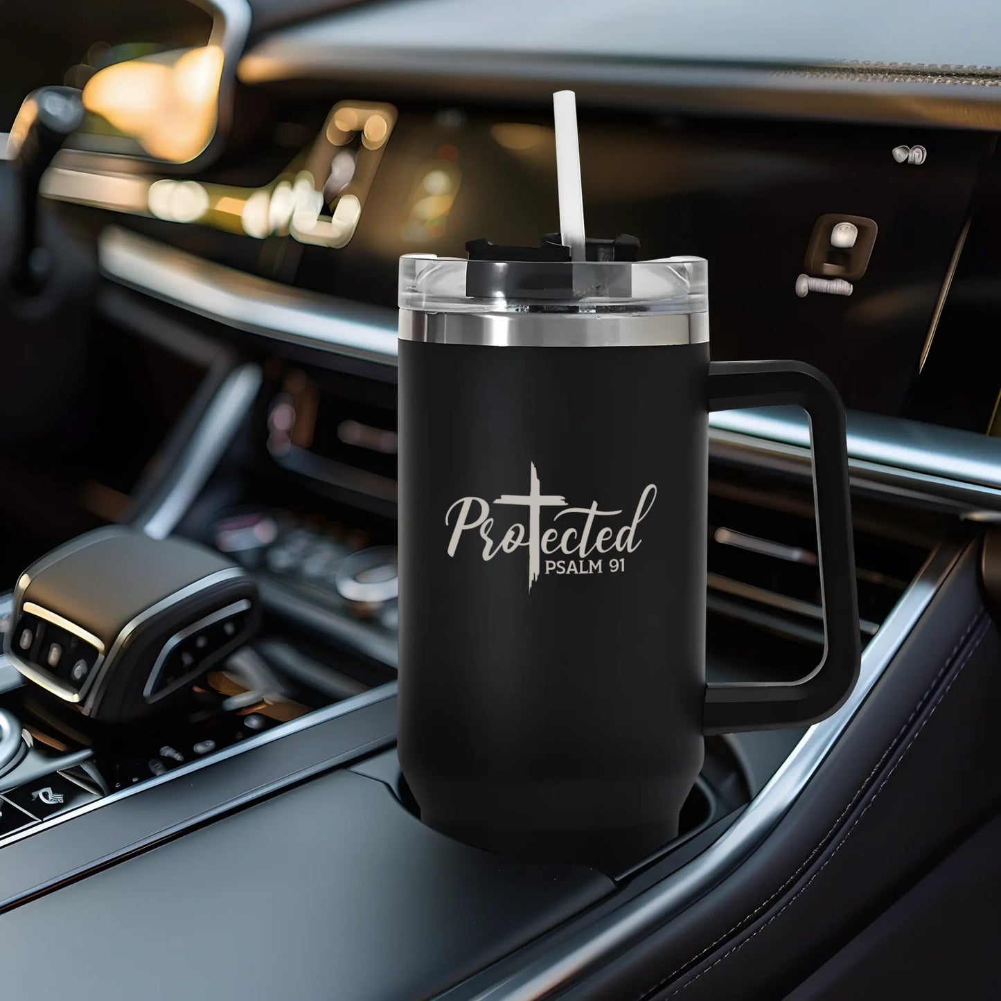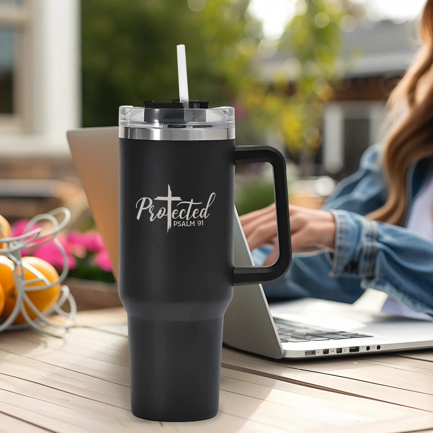 Psalms 91 Protected 40oz Stainless Steel Christian Tumbler Travel Mug with Handle and Straw for Cup Holder