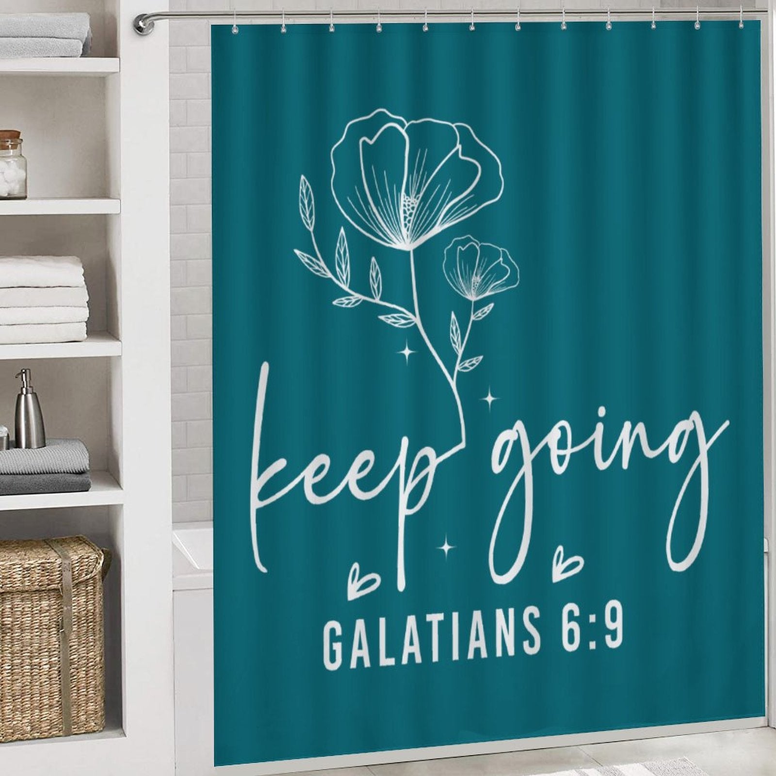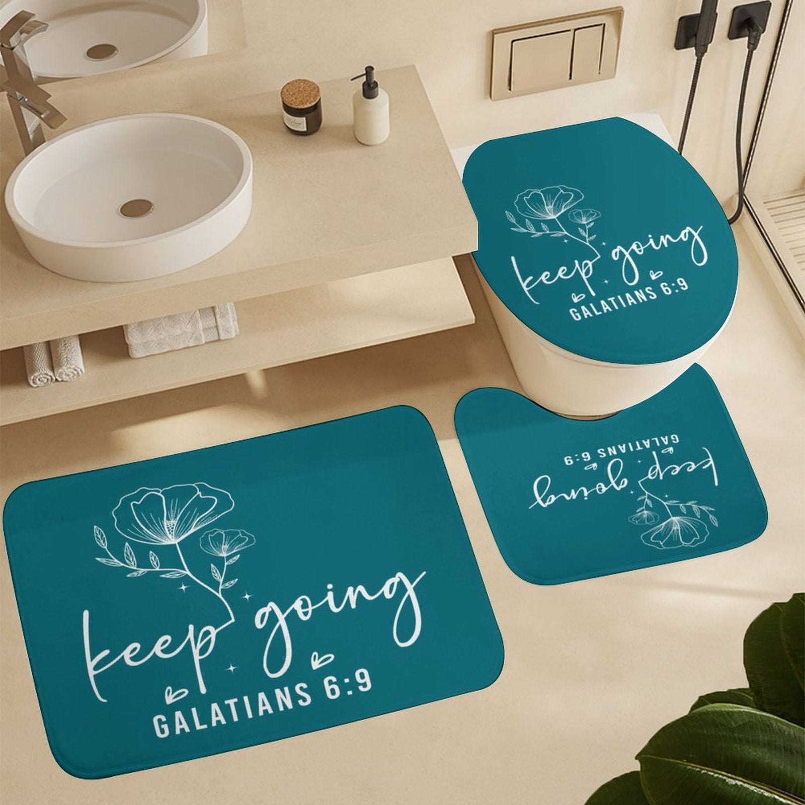 Keep Going Christian Shower Curtain Set with a bath rug, a contour rug and a toilet lid