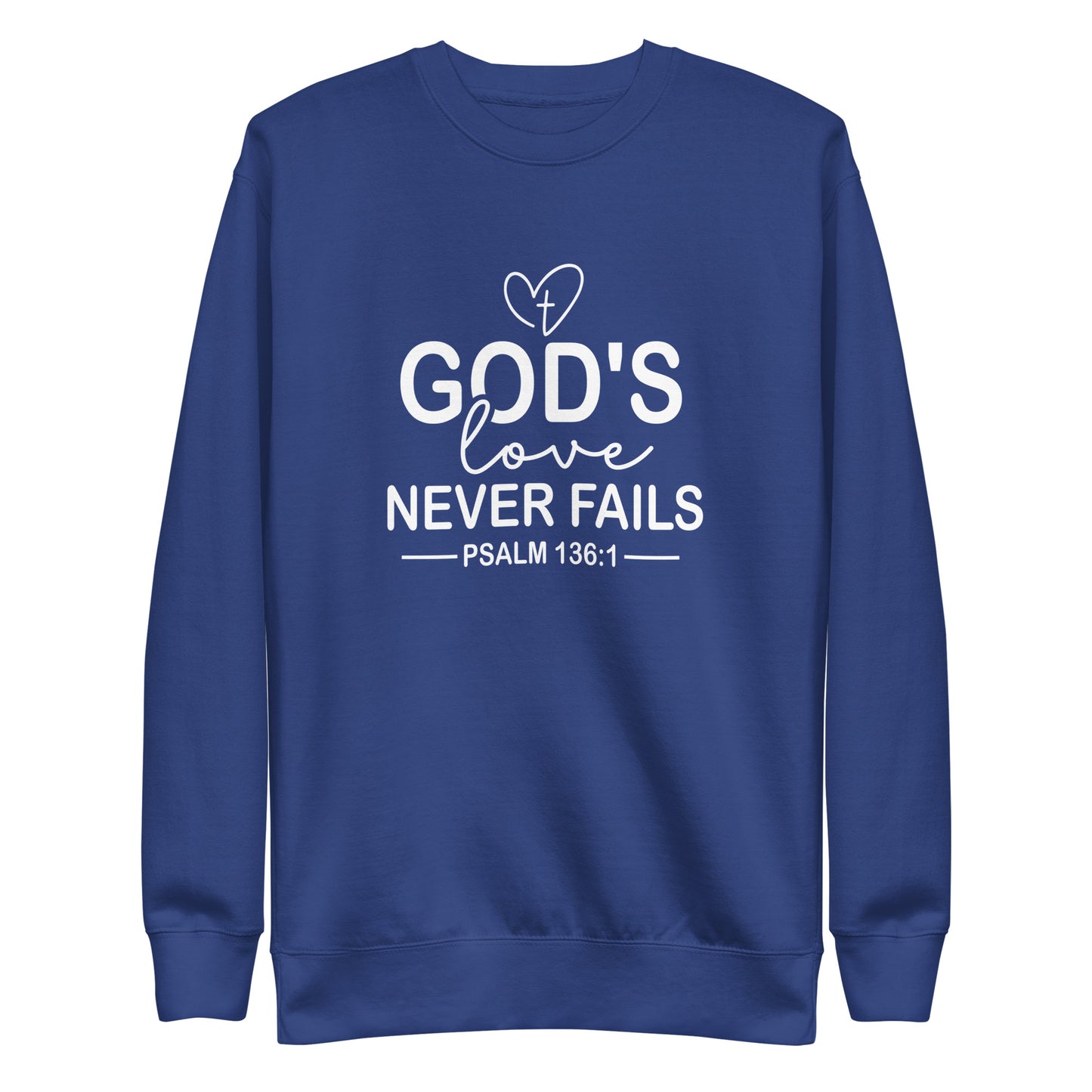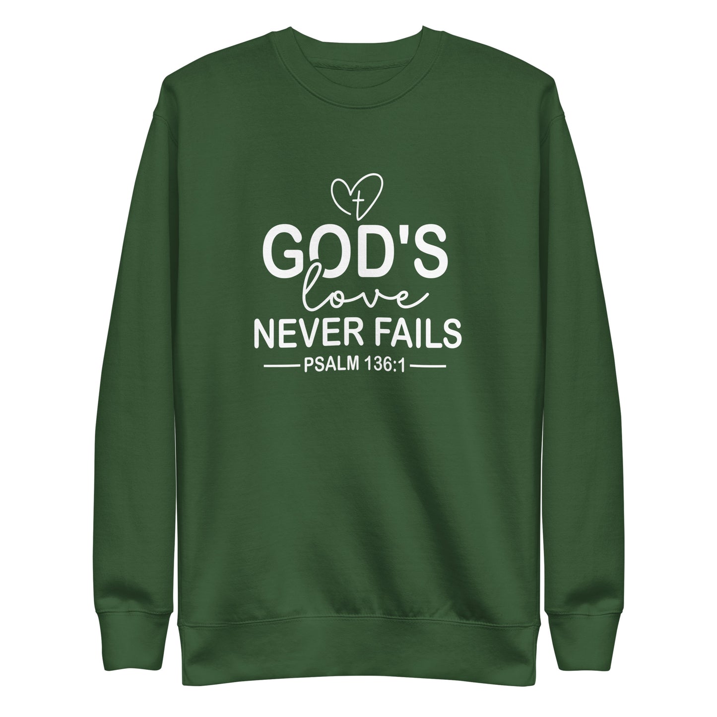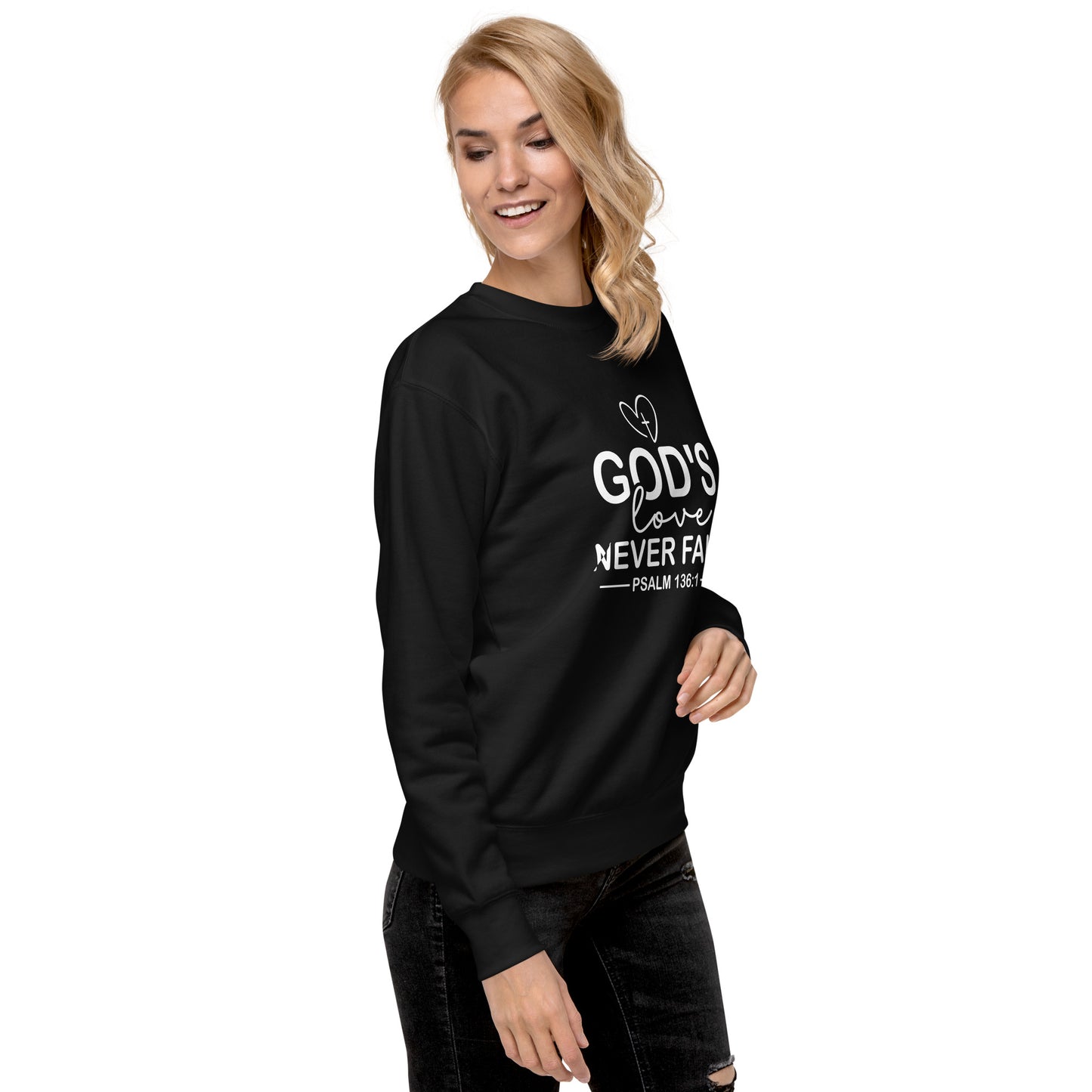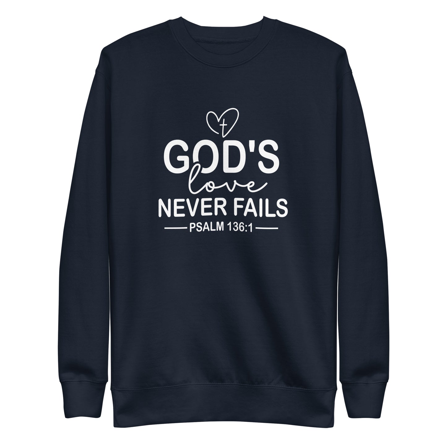 His Love Never Fails Unisex Christian Premium Crewneck Sweatshirt - Faith-Inspired Apparel