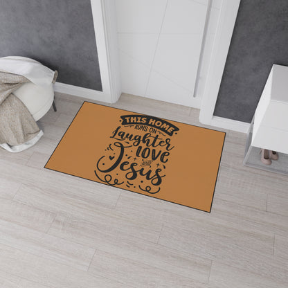 This heavy duty floor mat with a Christian design stating 'This Home Runs On Laughter Love And Jesus' is perfect for those looking to add a touch of faith and inspiration to their homes. It provides a strong and durable surface for wiping shoes, with vibrant colors that won't fade. Ideal for Christian households or as a gift for religious holidays and occasions. Product features - Polyester front, rubber back for durability - Vibrant colors that won't fade - Anti-slip backing for stability - One sided print with black trim - Assembled in the USA from globally sourced parts Care instructions - Hand wash - Clean by wiping with a soft, damp cloth.