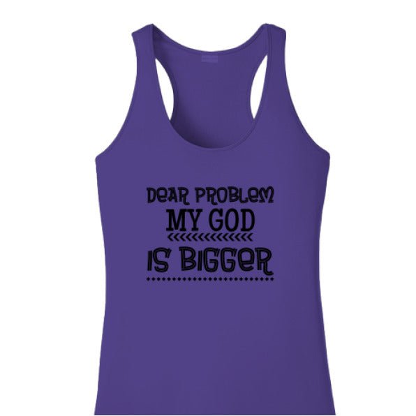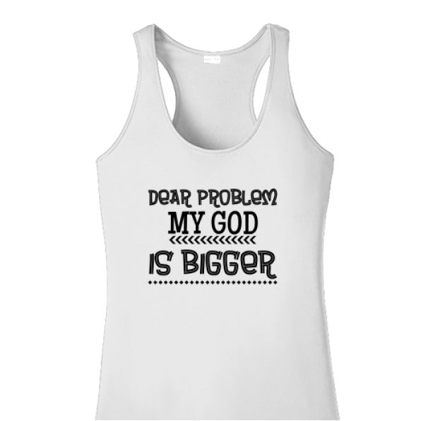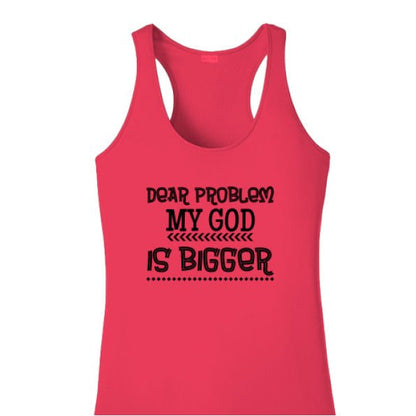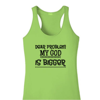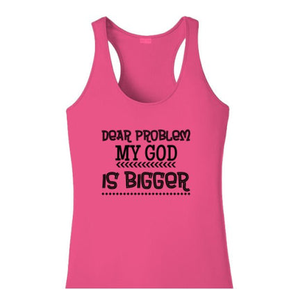 Face challenges with faith in the Dear Problem Women's Christian Racerback Tank Top, designed for comfort, durability, and style.