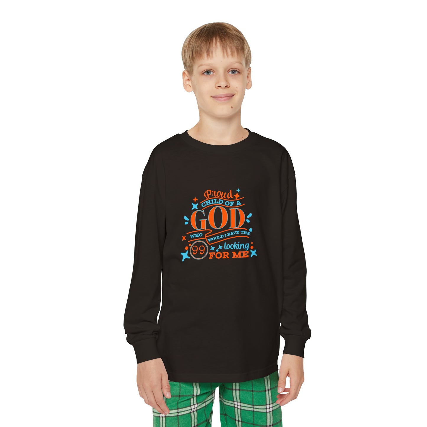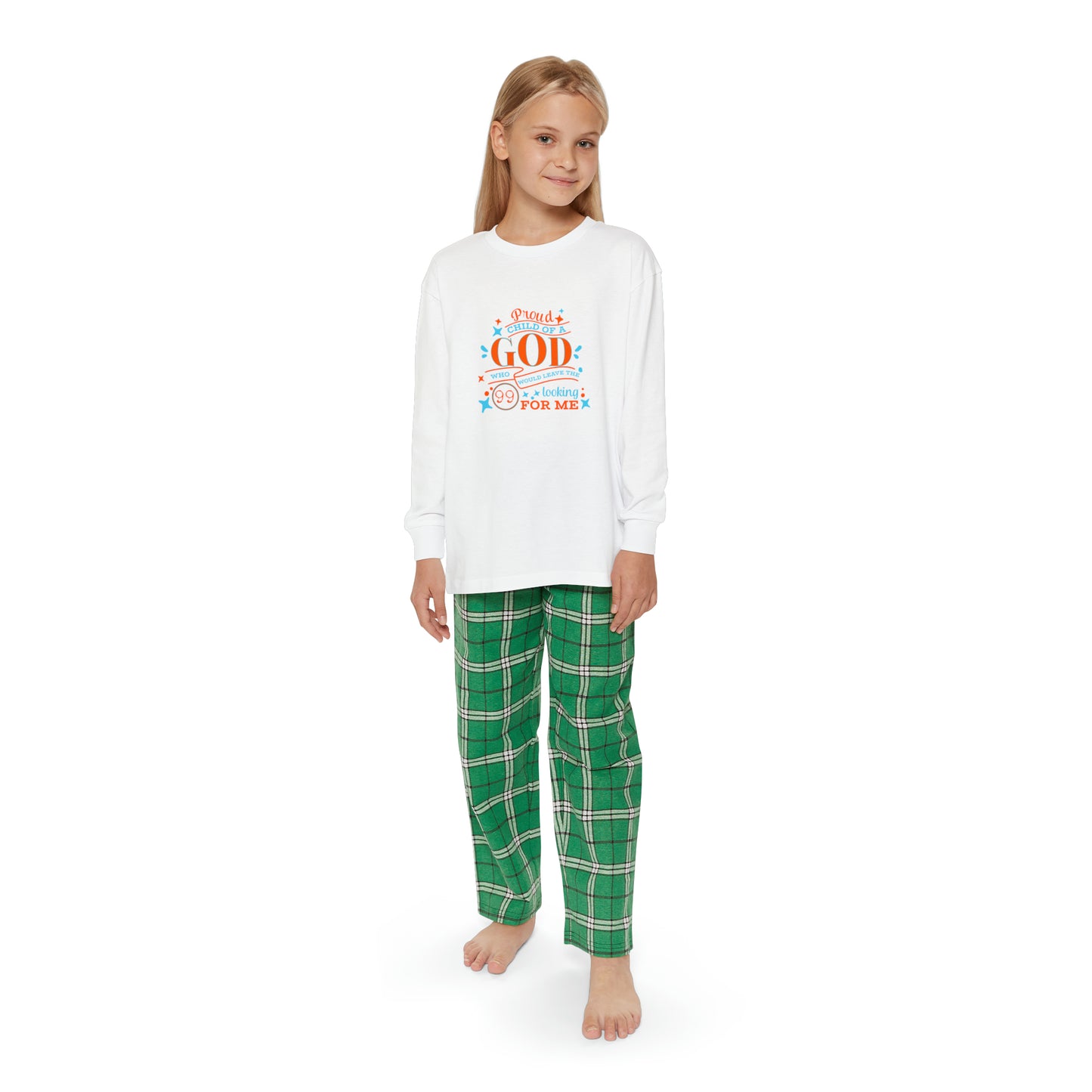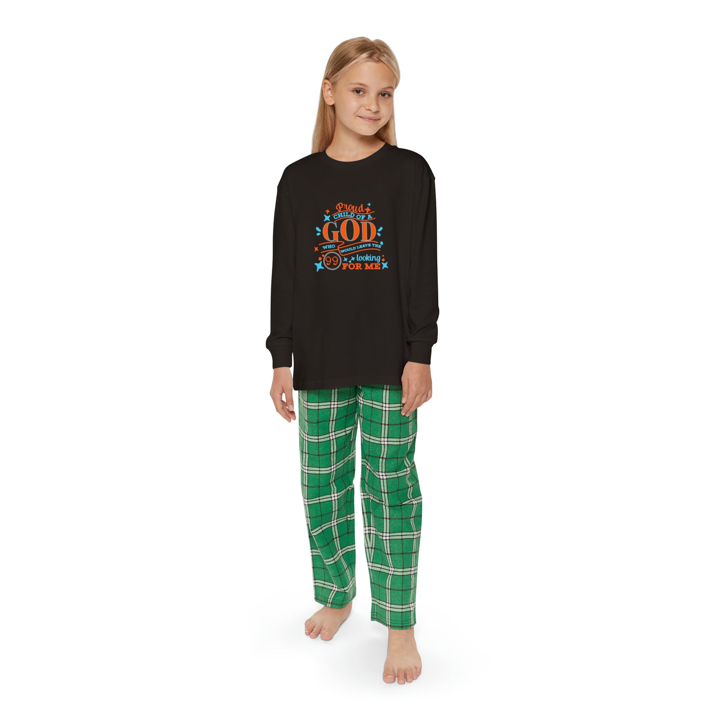 Proud Child Of A God Who Would Leave The 99 Looking For Me Youth Christian Long Sleeve Pajama Set Printify