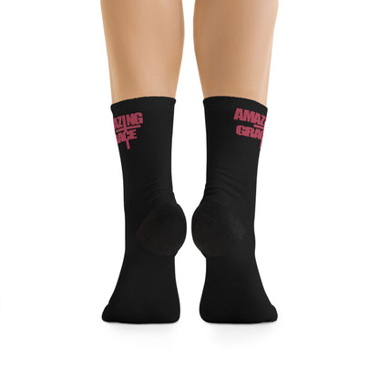 These socks are made using a proprietary blend of yarns specially sourced by Tribe Socks. They are 200 needle knit crew made from 58% Recycled Polyester 22% Nylon 15% Cotton and 5% Elastane. They are a true one size fits most, and are available up to size 12 Men's (U.S.). These socks have an unprecedented amount of stretch with durable print quality.