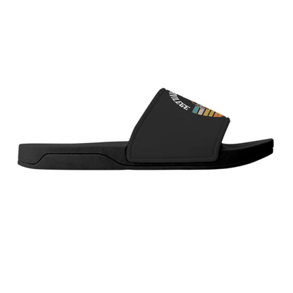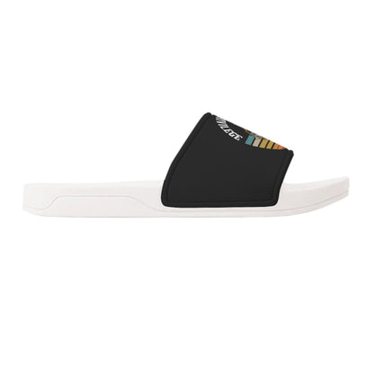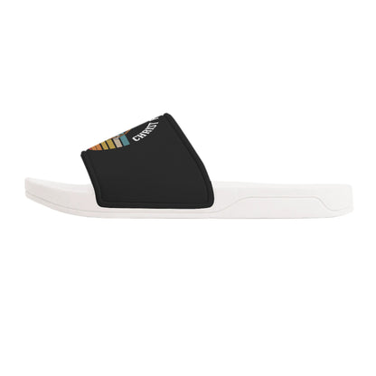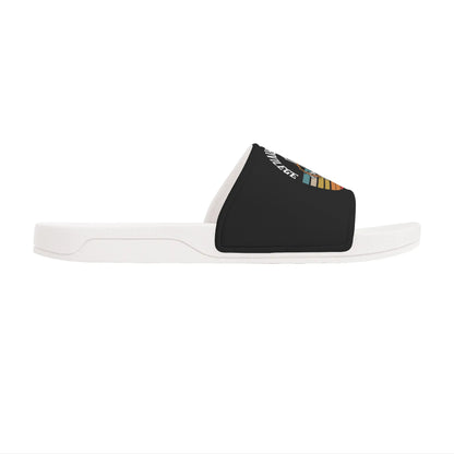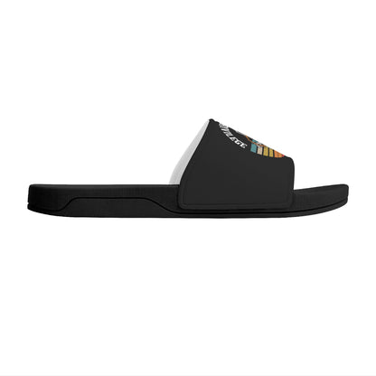 * Custom printed slide sandals with open toe and flat heel style construction.