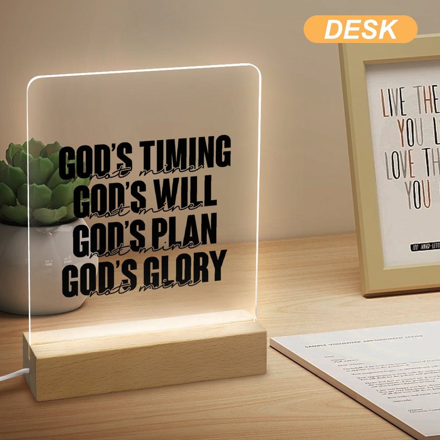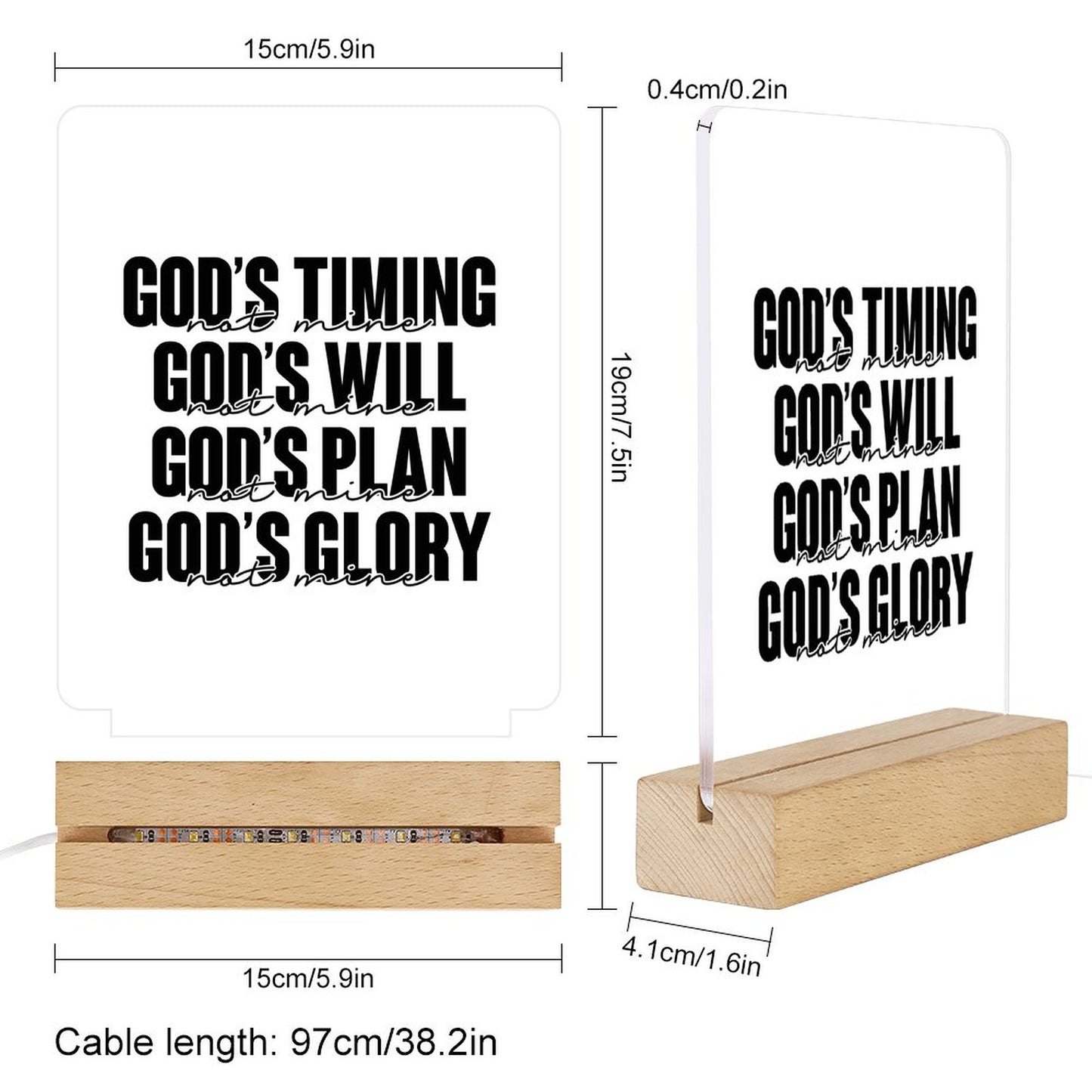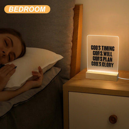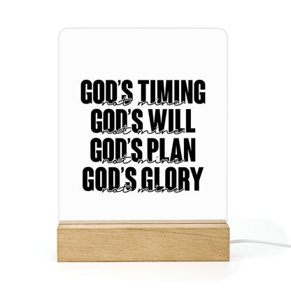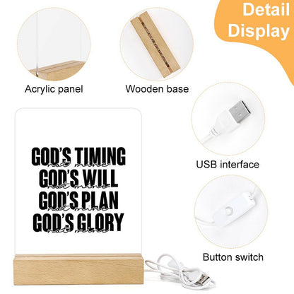 His Timing, Will, Plan, Glory Not Mine Christian Acrylic Night Light with Wooden Base Christian Gift Idea