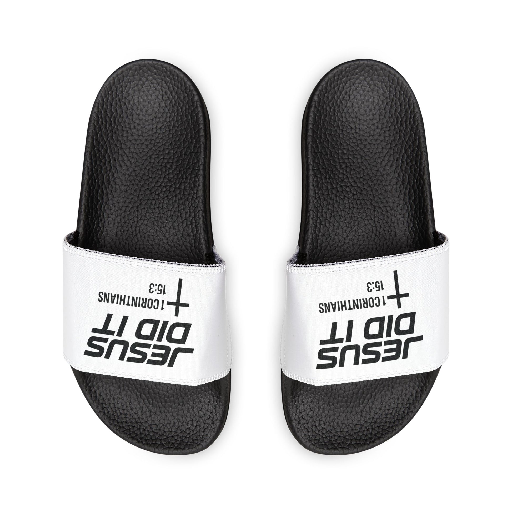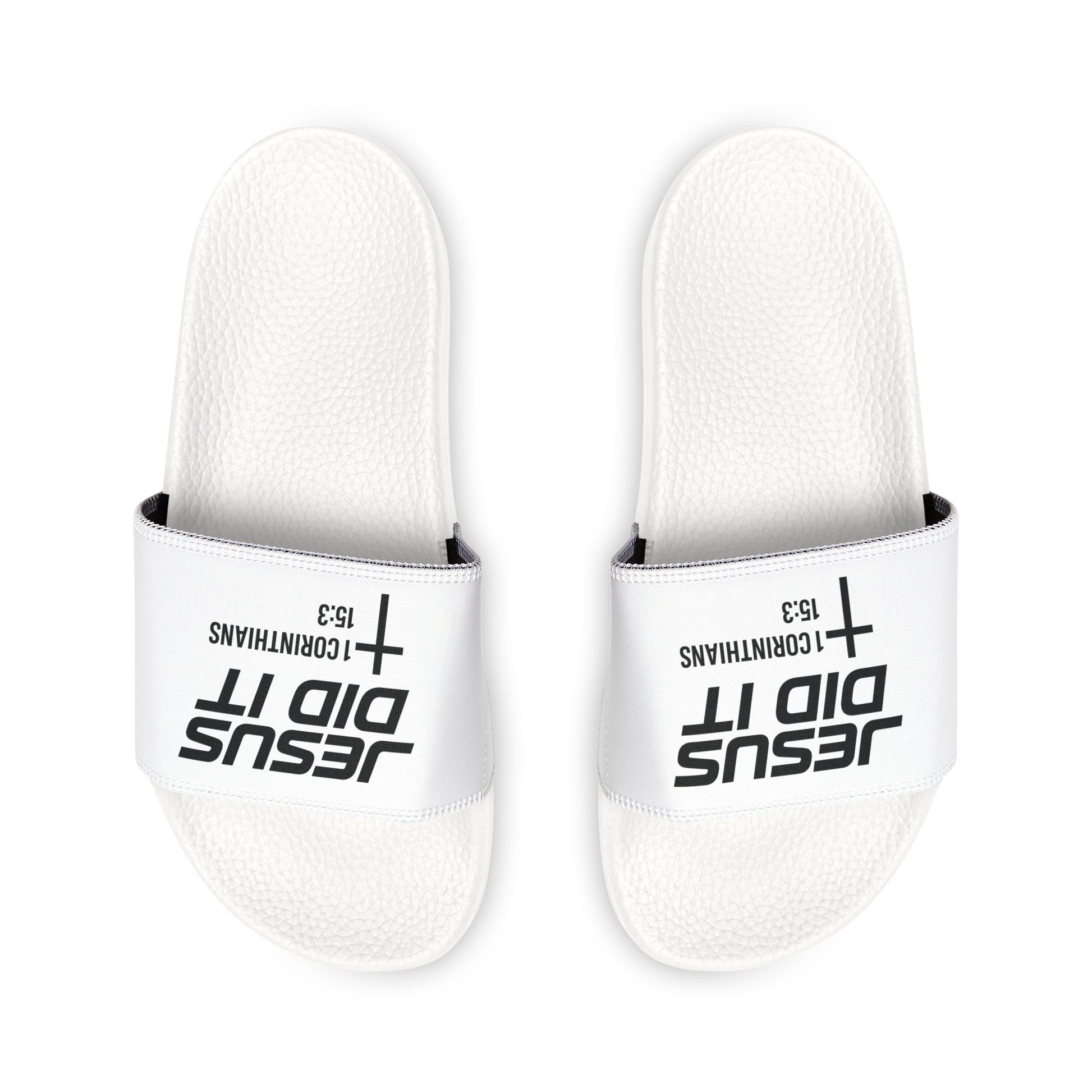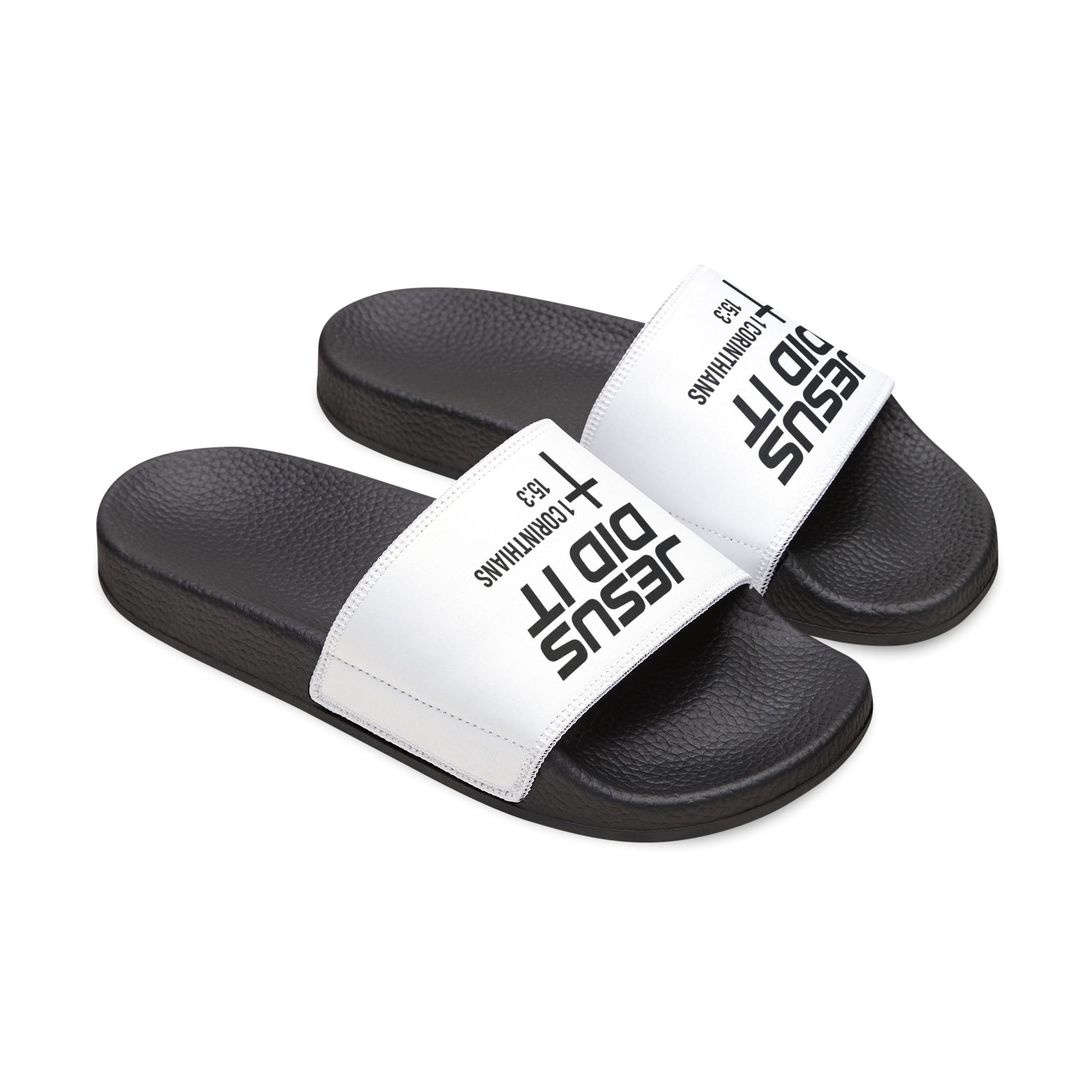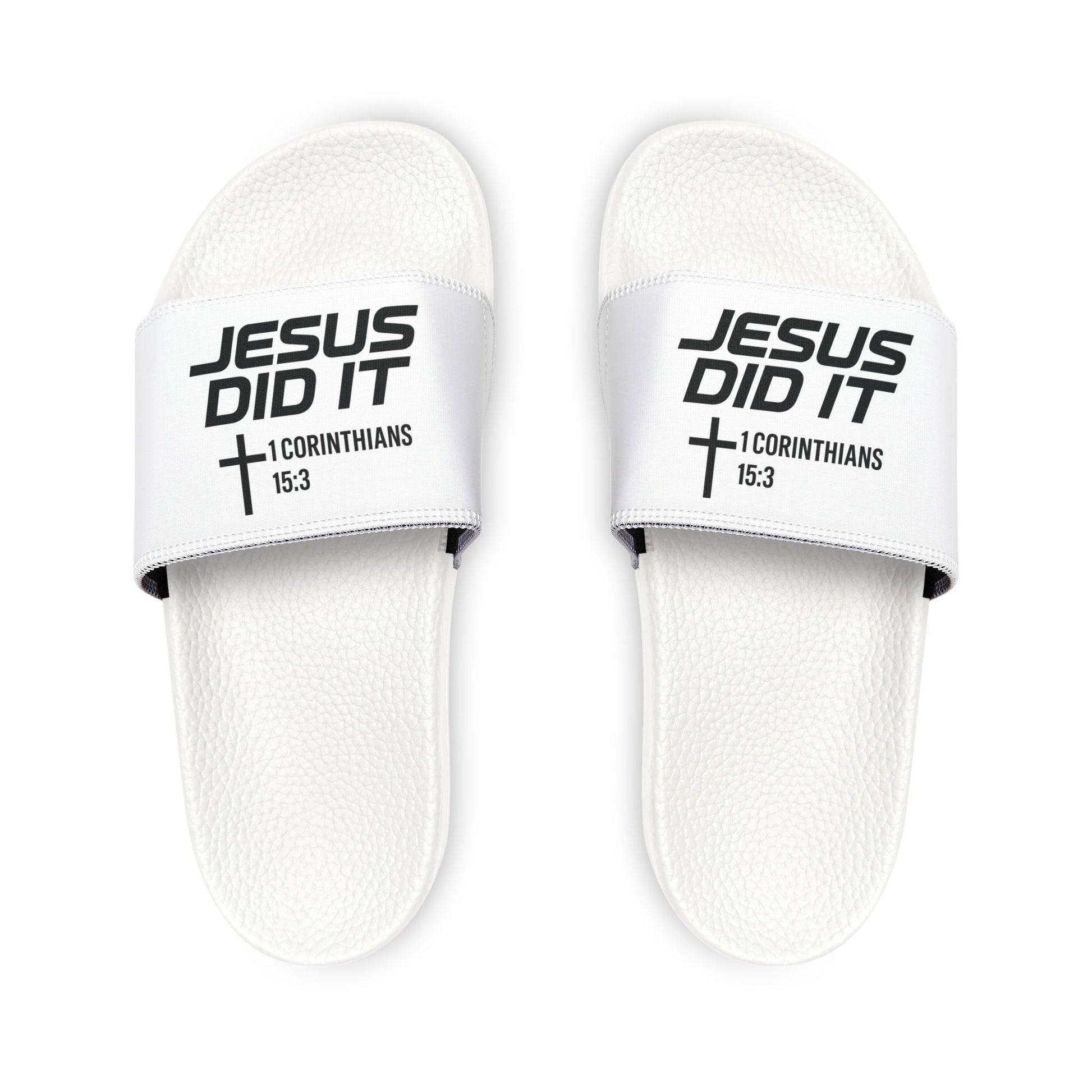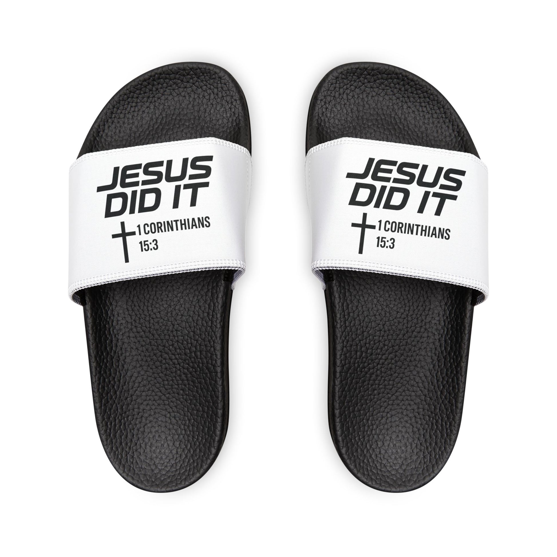 He Did It Men's Christian Slide Sandals — Christian Scripture 1 Corinthians 15:3 Pool Slides