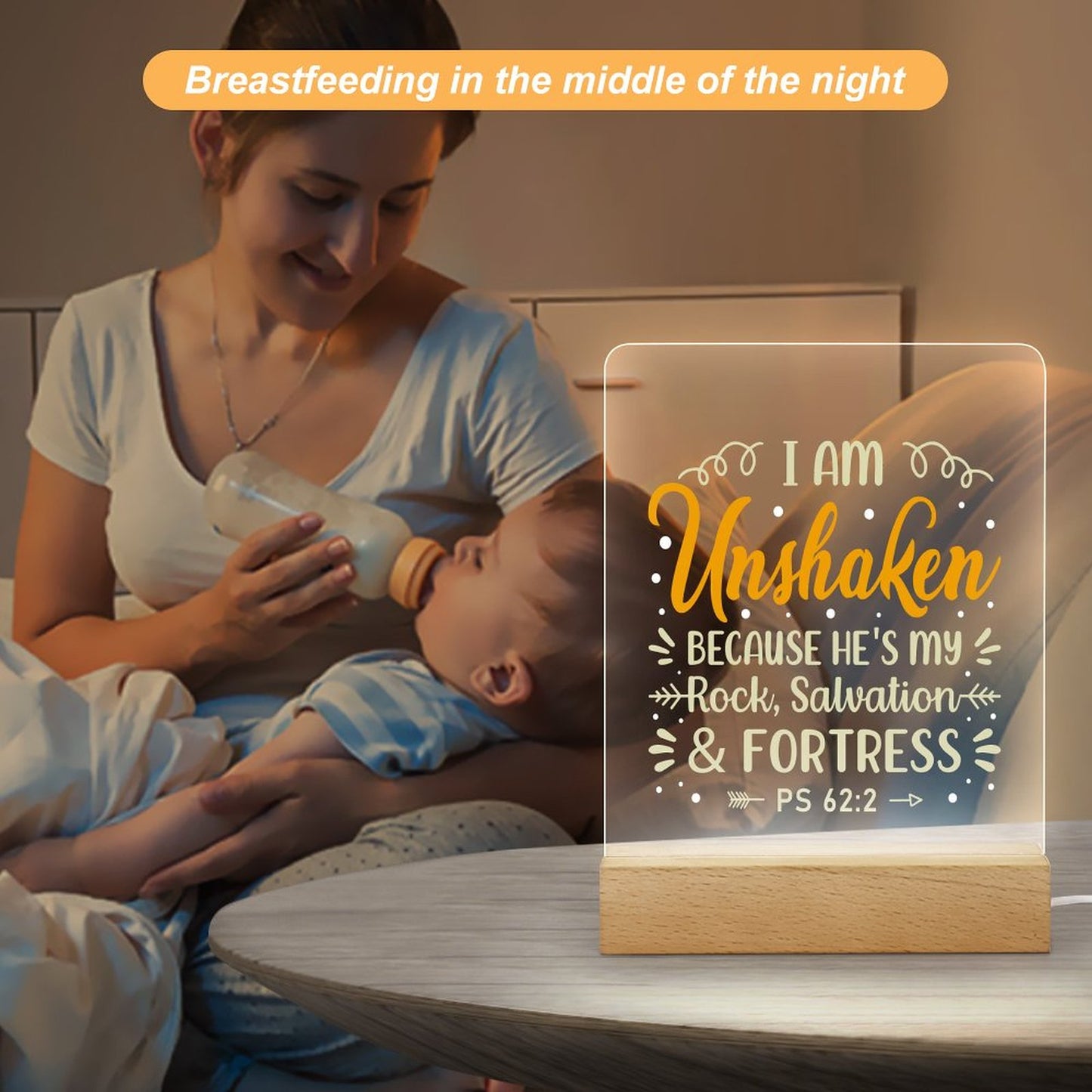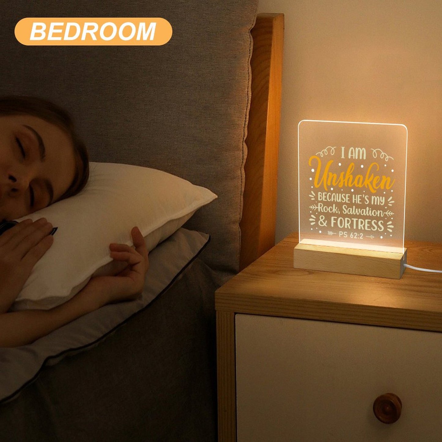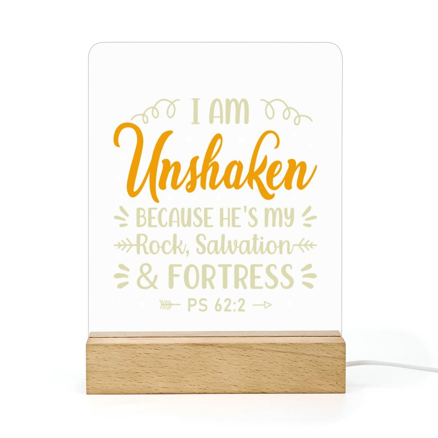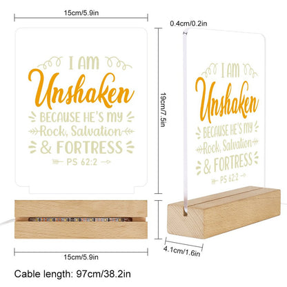 I Am Unshaken Because He's My Rock Salvation And Fortress Christian Acrylic Night Light with Wooden Base Christian Gift Idea