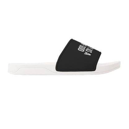 * Custom printed slide sandals with open toe and flat heel style construction.