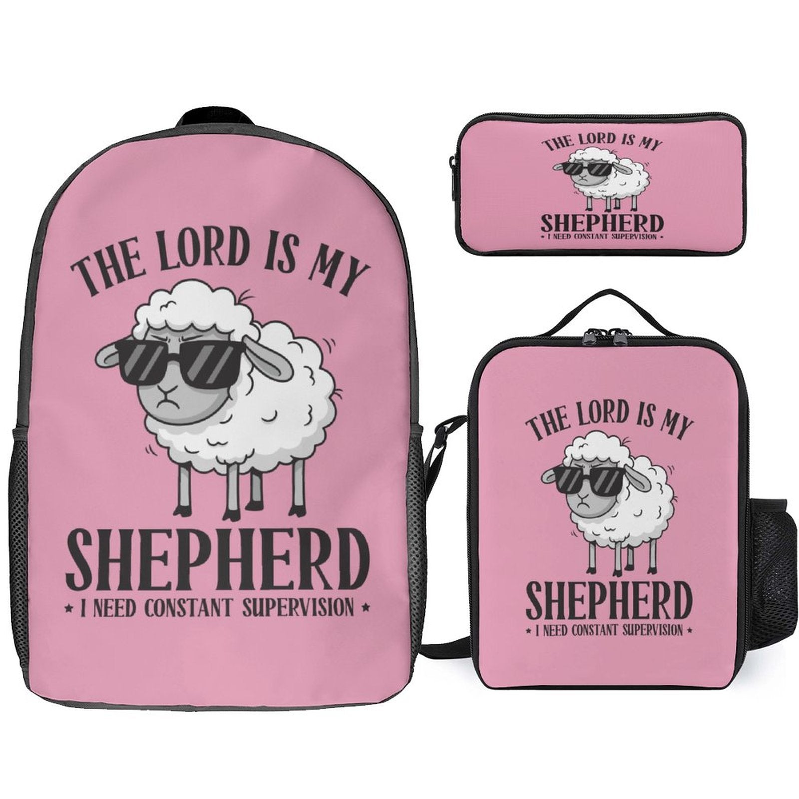 Playful, practical, and full of faith—this 3‑piece Christian school set is designed for kids who love to learn, explore, and keep everyone on their toes. Featuring the fun and relatable message “The Lord Is My Shepherd, I Need Constant Supervision,” this matching set blends durability, comfort, and personality with a bold reminder of God’s guidance.