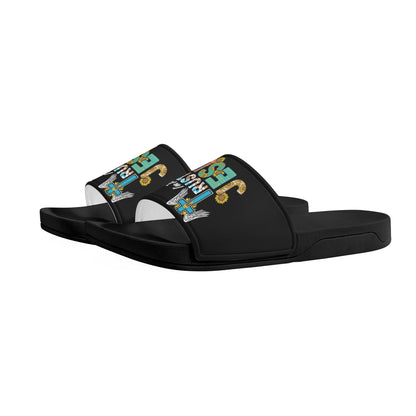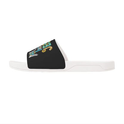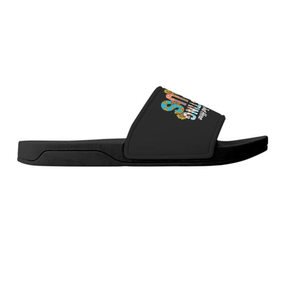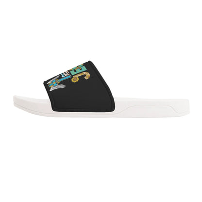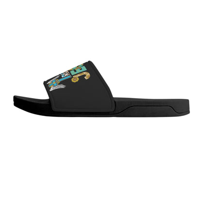 * Custom printed slide sandals with open toe and flat heel style construction.