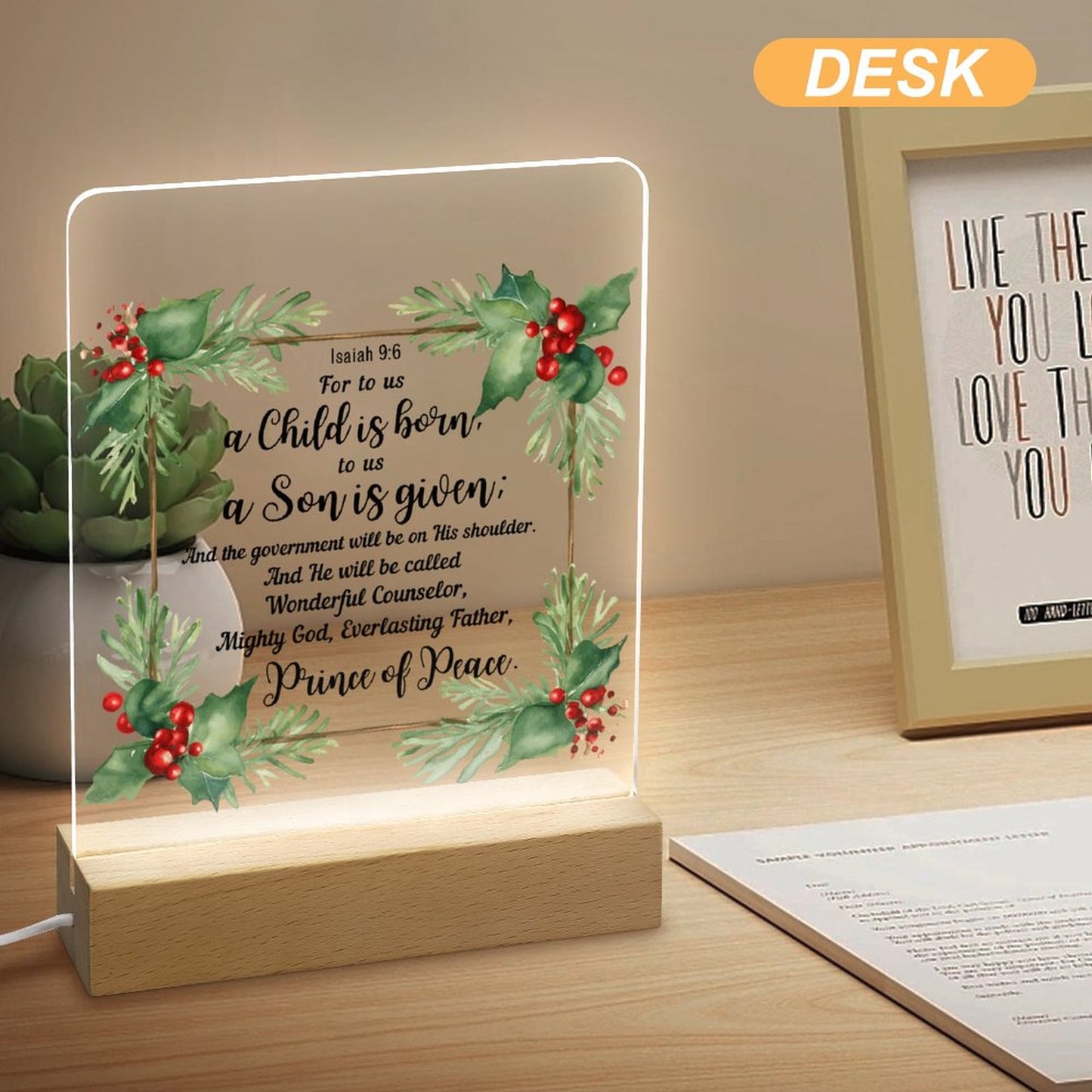 Isaiah 9:6 For To Us A Child Is Born (Christmas Themed) Christian Acrylic Night Light with Wooden Base