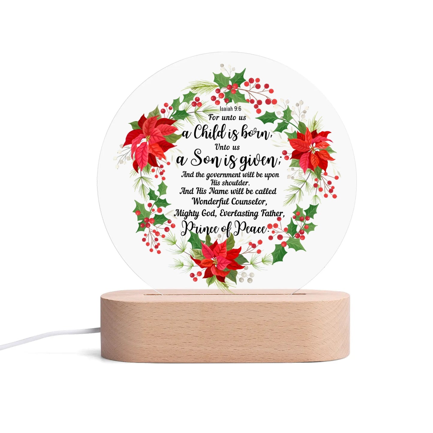 Isaiah 9:6 For Unto Us A Child Is Born (Christmas themed) Christian Acrylic Round Lamp Night Light Home Decor