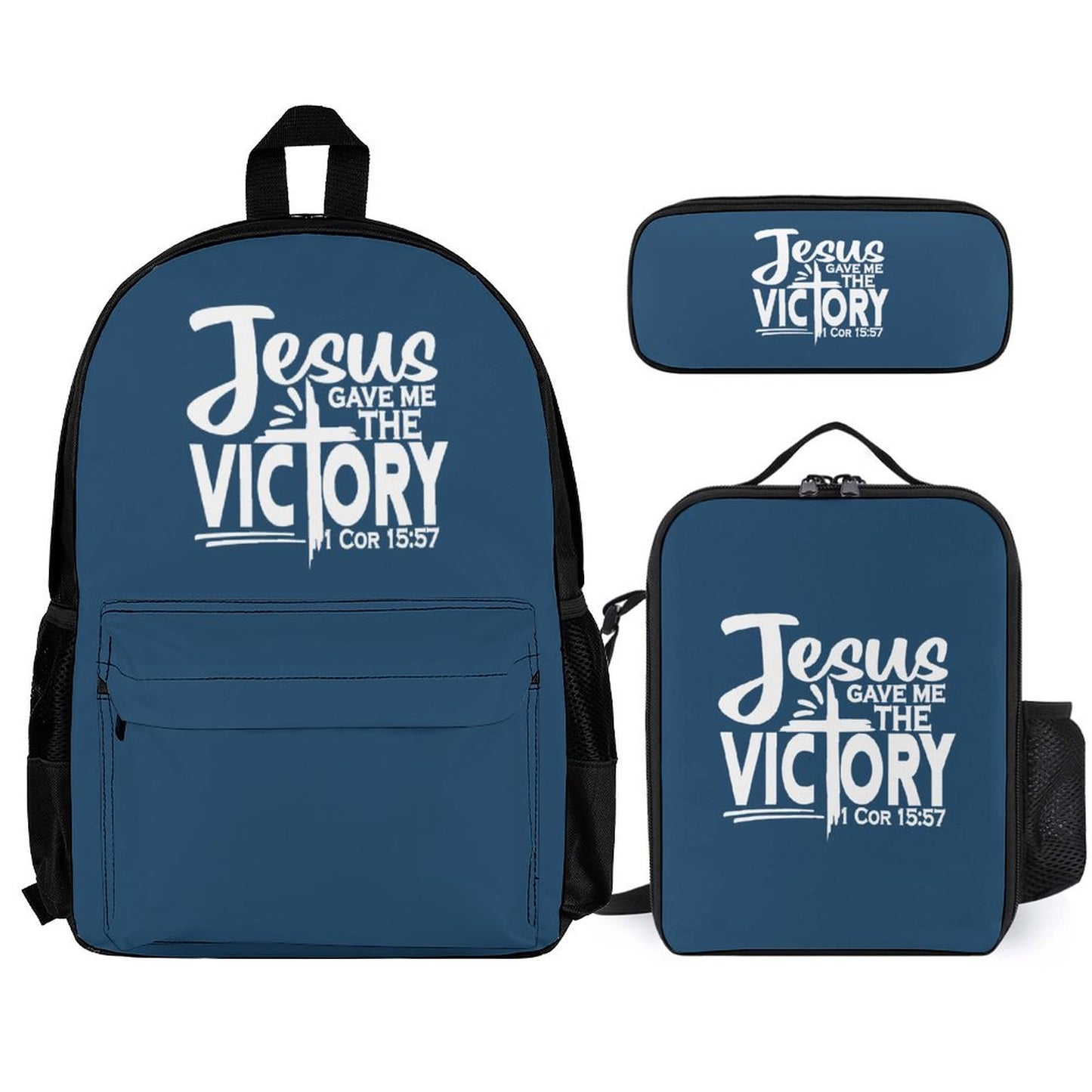 He Gave Me The Victory Christian Backpack Set of 3 Bags (Shoulder Bag Lunch Bag & Pencil Pouch)