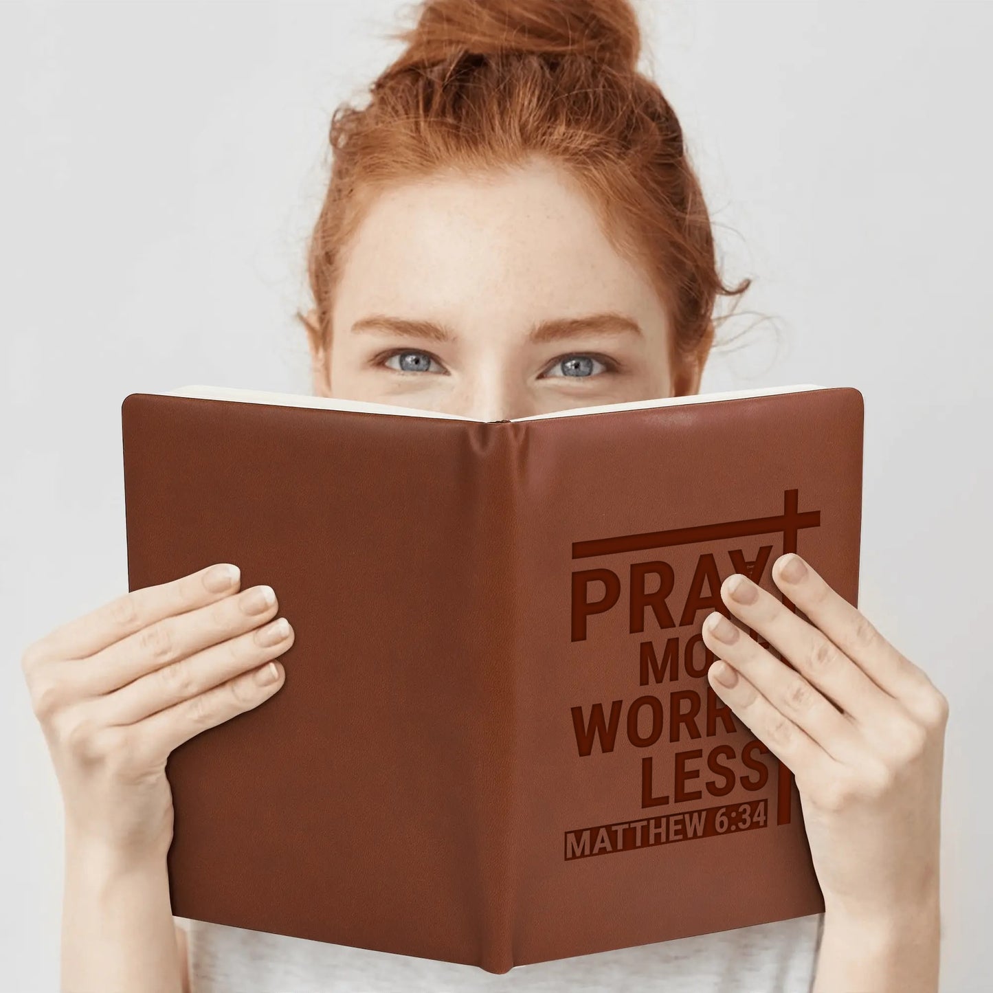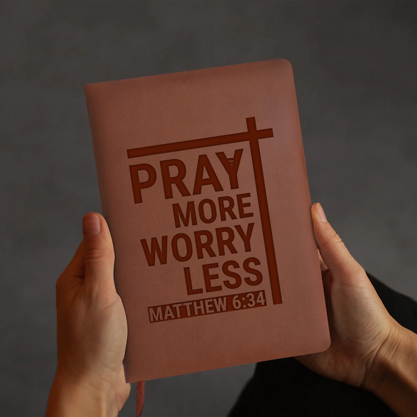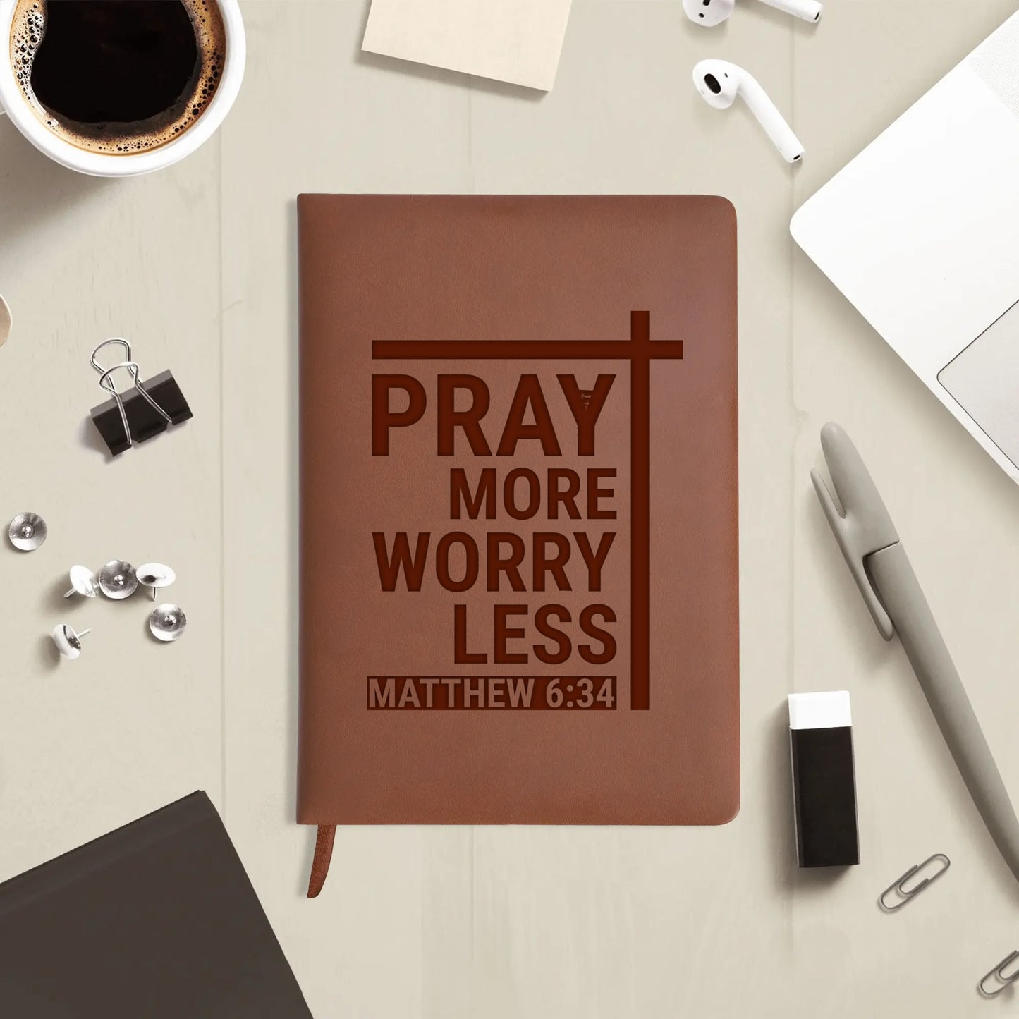 Matthew 6:34 Pray More Worry Less Engraved Brown Christian Journal Diary Gift for Friends Family