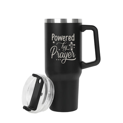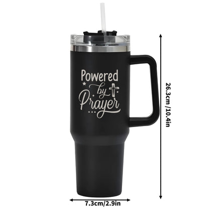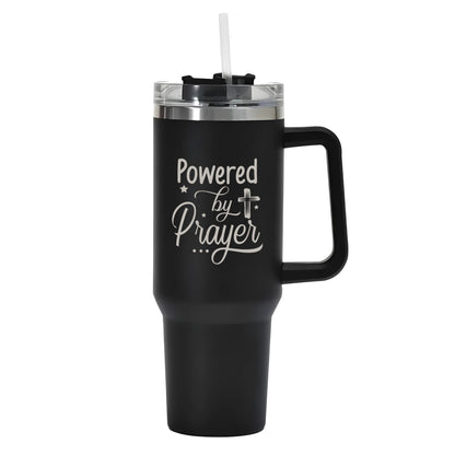 Powered By Prayer 40oz Stainless Steel Christian Tumbler Travel Mug with Handle and Straw for Cup Holder