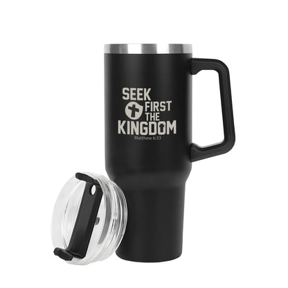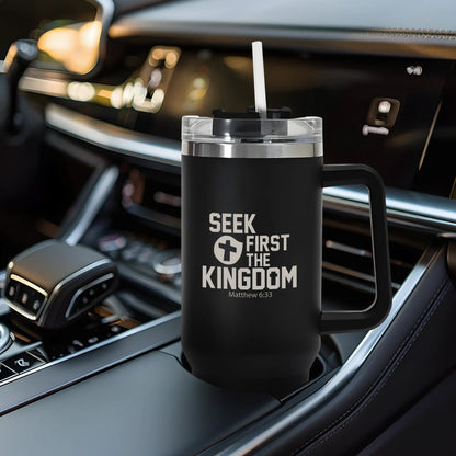 Seek First The Kingdom 40oz Stainless Steel Christian Tumbler Travel Mug with Handle and Straw for Cup Holder