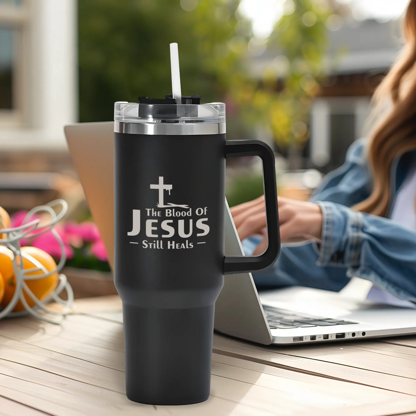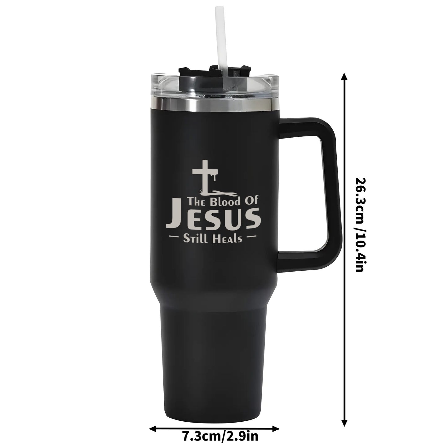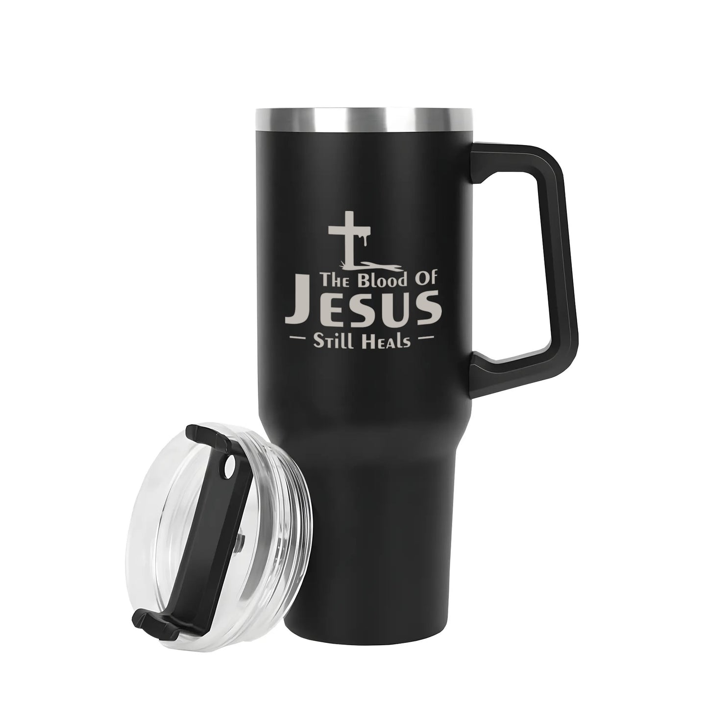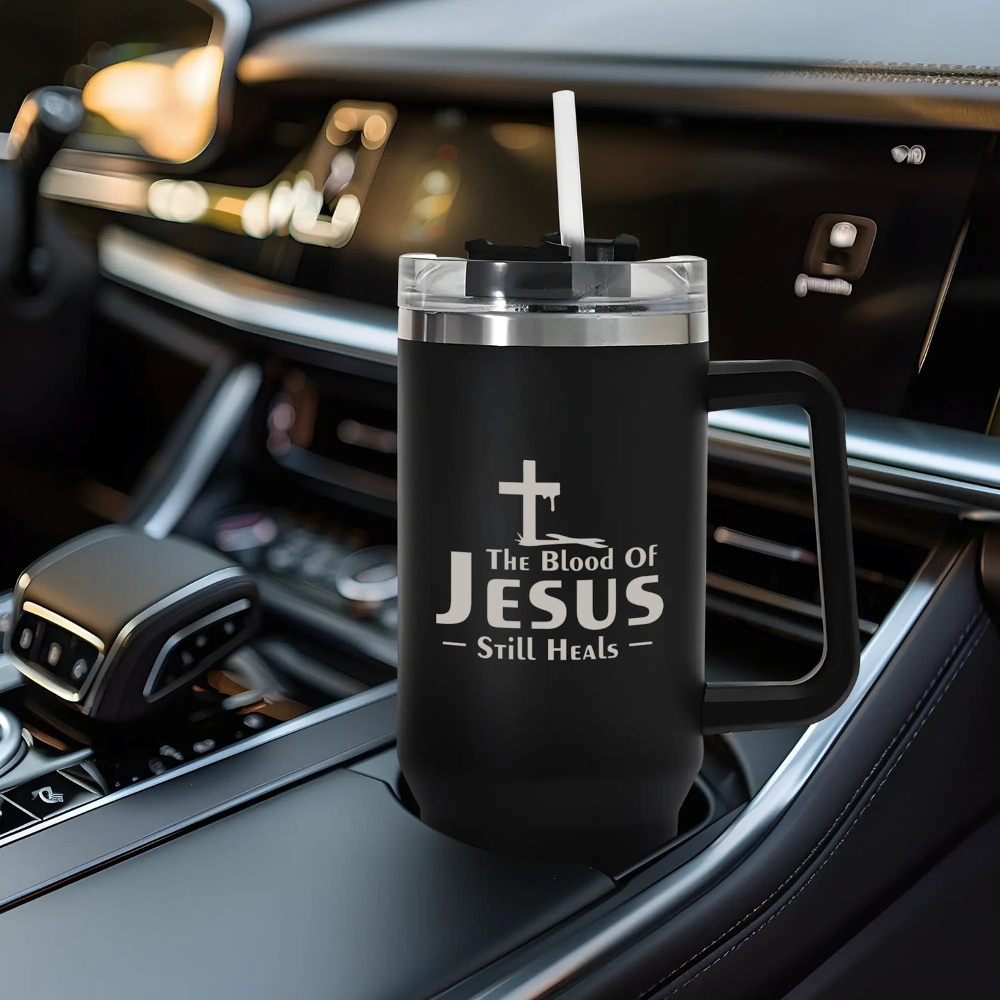 His Blood Still Heals 40oz Stainless Steel Christian Tumbler Travel Mug with Handle and Straw for Cup Holder
