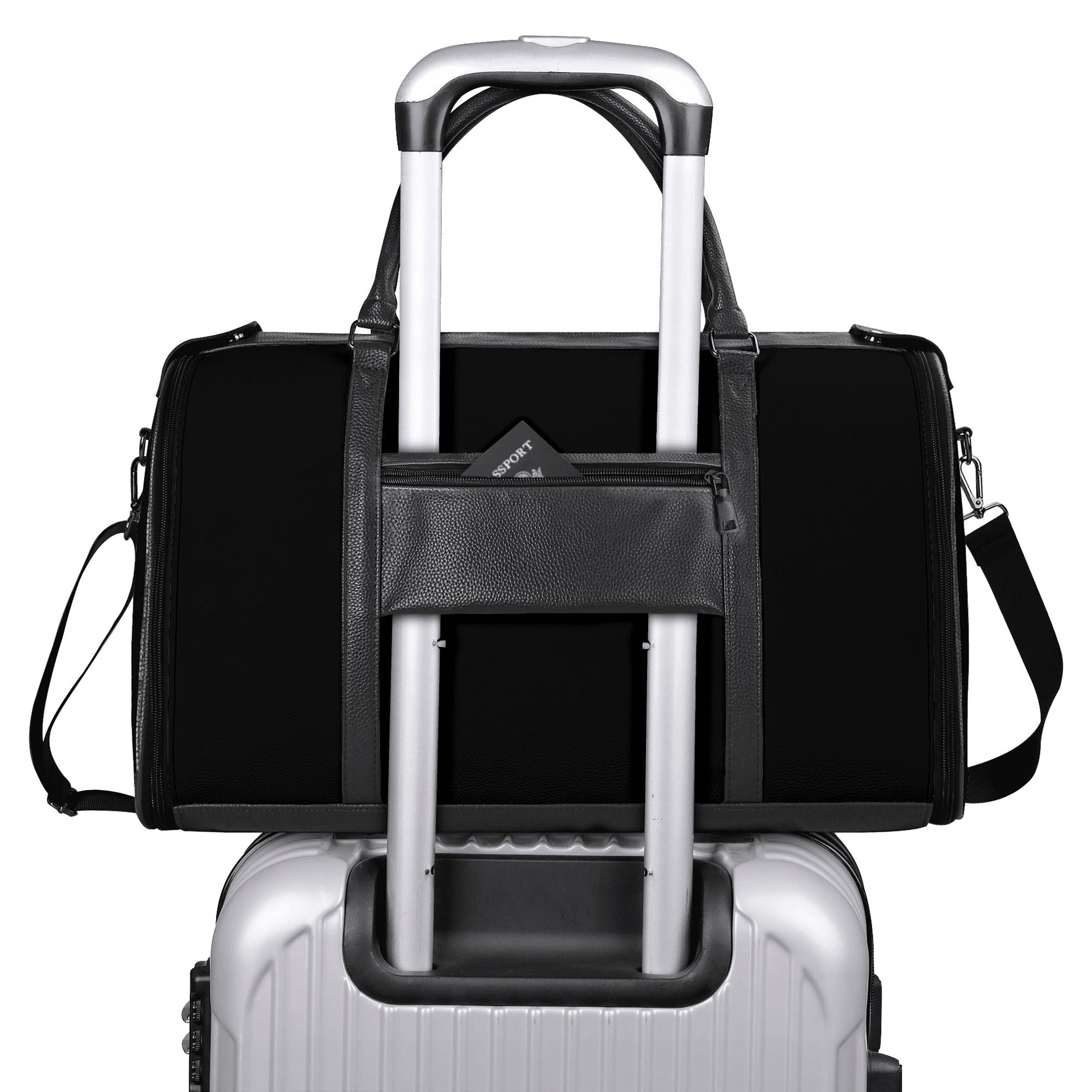 Features :  It features  a roomy main compartment that easily holds a variety of items , a hanger lanyard to hanging your suits ,and with storage and zipper pockets for many things . Side pockets for shoes . Metal zippers are engineered for durability, reliability, and easy opening and closing.